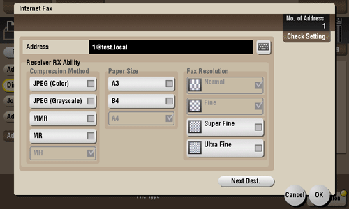 [Receiver RX Ability] | Sets the [Compression Method], [Paper Size], and [Fax Resolution] properties of original data that the destination machine can receive. |