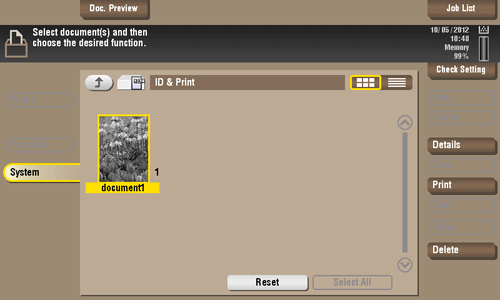 When you print a document from the PC in the user authentication system environment, the files transferred with the ID & Print function are stored in the ID & Print User Box. When a user who has sent the print data logs in to this machine and opens the User Box, he/she can preview, print out, or delete the stored file.