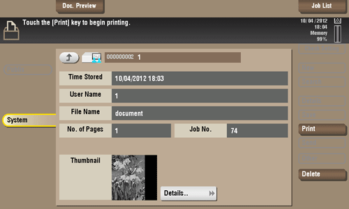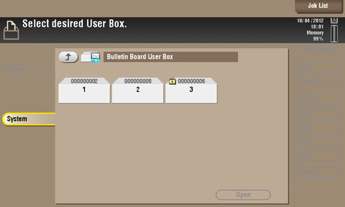 You can create and register up to 10 Bulletin Board User Boxes. Once you have opened the User Box, you can select a fax document stored in the User Box and preview, print out, or delete it.