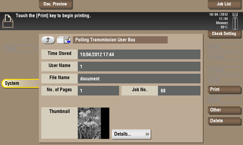 The fax documents required for polling are stored in the Polling Transmission User Box. Once you have opened the User Box, you can select a fax document stored in the User Box and preview, print out, or delete it.