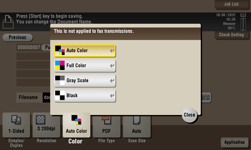 [Auto Color] | Scan by automatically selecting either [Full Color] or [Gray Scale] according to the original color. |