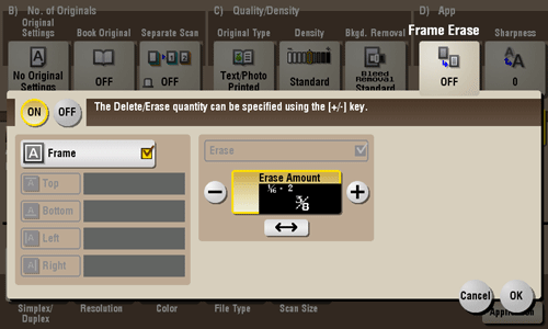Clear the [Frame] check box, select a side ([Top], [Bottom], [Left] or [Right]) and specify the width of the area in [Erase Amount] by tapping [+]/[-] for an inch area and by tapping [+]/[-] or Keypad for a centimeter area. To display the Keypad, tap the input area for the numeral.