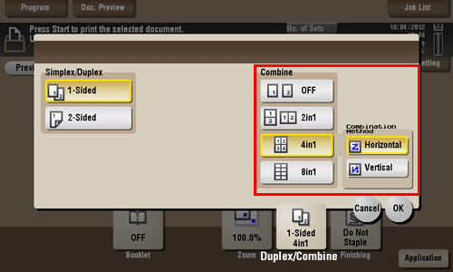 If [4in1] or [8in1] is selected, you can set the combined page layout to [Horizontal] or [Vertical].