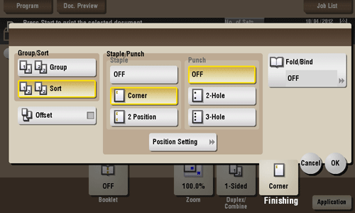 [Punch] | Select binding positions when punching sheets. For details, refer to Here. |
