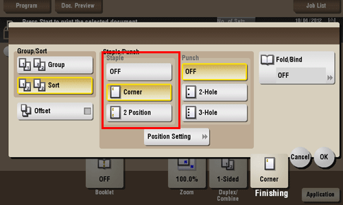 Each set of printed sheets is stapled in a corner (top left or top right) before it is output.