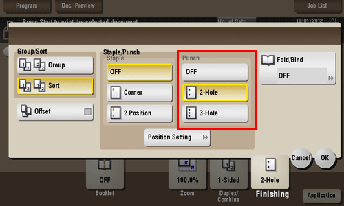 [Position Setting] | Select a position to punch. If the punch position is set to [Auto], the position to punch is determined automatically based on the direction of print file. |