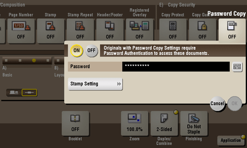 Password Copy is a copy protection function that prints concealed security watermarks such as "Private" or a date in the background to prevent unauthorized copying, and embeds a password for the password copy function on all printed sheets.
