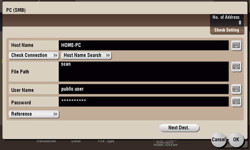 [Reference] | On the Touch Panel, search for a computer to send a file to, and select a target shared folder. When the authentication screen appears, enter the name and password of a user who has privileges to access the selected folder. After authentication, [Host Name] or [File Path] is entered automatically. The Reference function may fail under the following conditions.