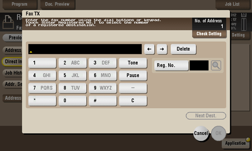 Enter the recipient fax number to send a fax to. When specifying multiple destinations, tap [Next Dest.] to add destinations.
