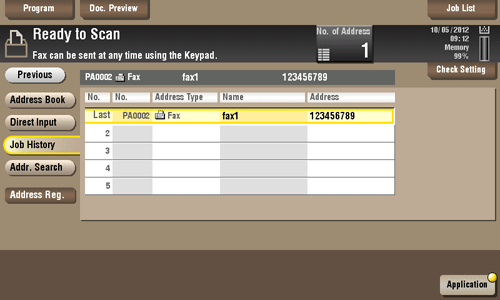 Select a destination from the Job History. The latest jobs (up to five) are displayed for history purposes. When necessary, multiple destinations can be selected from the history.