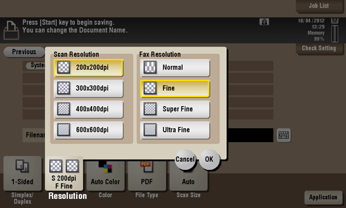 [Scan Resolution] | Select a resolution for the original when it is saved on an external memory.