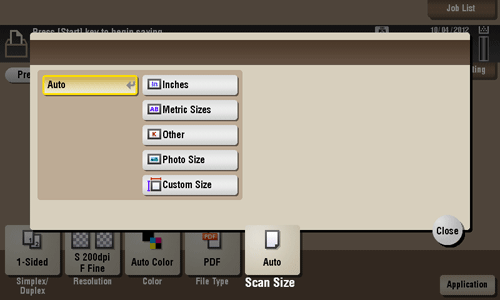 [Inches] | Select this option to scan a file in inch size. Tap [Inches], and select a standard inch size. |