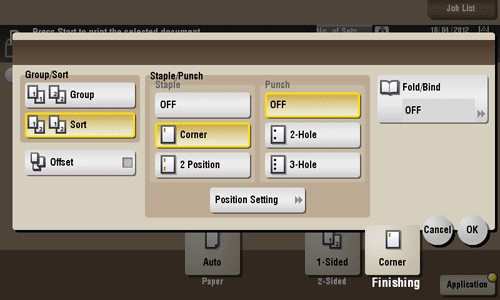 [Punch] | Select binding positions when punching sheets. For details, refer to Here. |