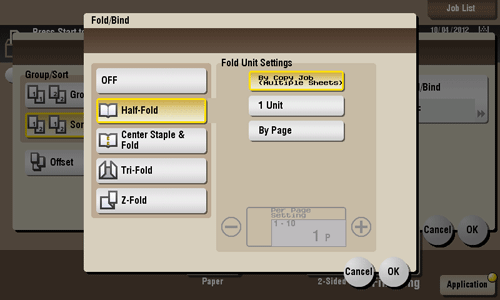 Feeds out a printed sheet by folding it in two. Also select the unit by which the paper is folded from [By Copy Job (Multiple Sheets)], [1 Unit], and [By Page]. When you set [By Page], specify the number of pages to be folded at one time.