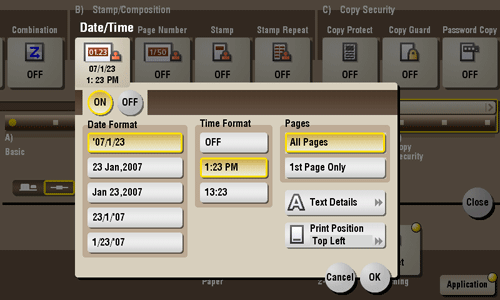 You can select a print position and format, and add the date and time. The date and time can be printed either on all pages or only on the first page.