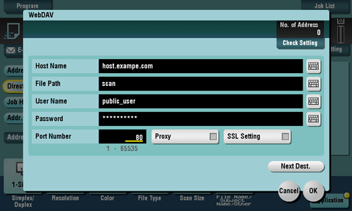 Enter a destination WebDAV server host name or IP address when scanned original data is sent to a WebDAV server.