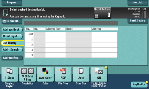 In [Job History], select a destination from the fax, scan or saved job history. The history shows the latest five fax destinations. When necessary, multiple destinations can be selected from the history.