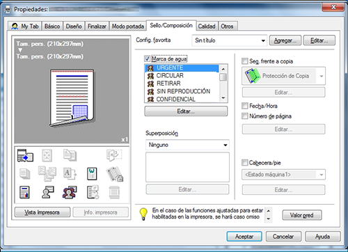 En la ficha [Sello/Composición], seleccione la casilla de verificación [Marca de agua]. Además, seleccione la marca de agua que desea imprimir.