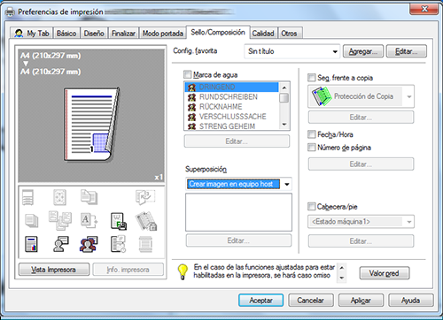 En [Superposición] en la ficha [Sello/Composición], seleccione [Imprim imag en equipo host] o [Imprimir imagen de dispos.] (PCL solamente) y, a continuación, seleccione en la lista la imagen de superposición que se va a imprimir en el original a modo de imagen compuesta.