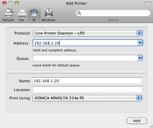En [Printer Address:], introduzca la dirección IP de la máquina.