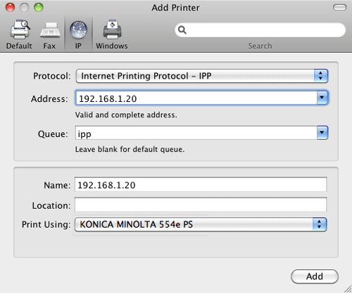 En [Address:], introduzca la dirección IP de la máquina. En [Queue:], introduzca "ipp".