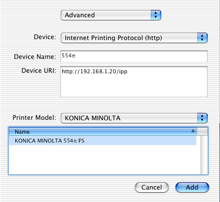 Ajuste el [Device:] a [Internet Printing Protocol (http)].