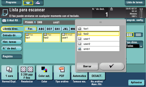 Si selecciona varios destinos, puede enviar datos por transmisión de difusión. También puede utilizar la transmisión de difusión combinando distintos modos de envío, como Escanear a e‑mail o Envío SMB.