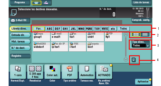Al seleccionar un Grupo en [Libreta direc.], seleccione los destinos a los que desea enviar datos de entre los destinos registrados en el grupo. Si hay un determinado destino que desea quitar del grupo de destinos registrados para el envío de datos, toque [Selec. todo] y, a continuación, toque en ese destino para cancelar la selección.