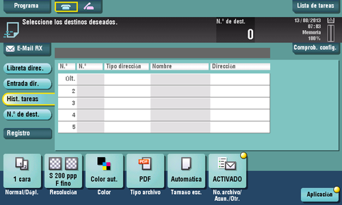 En [Hist. tareas], seleccione un destino del historial de destinos de transmisión de escaneado o destinos guardados.