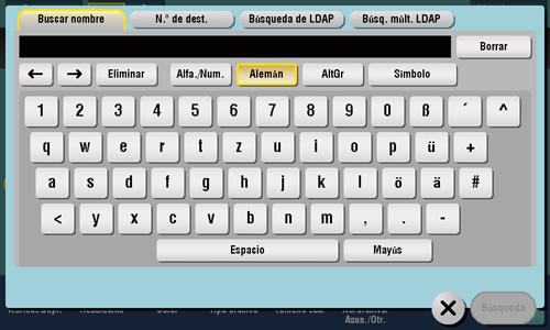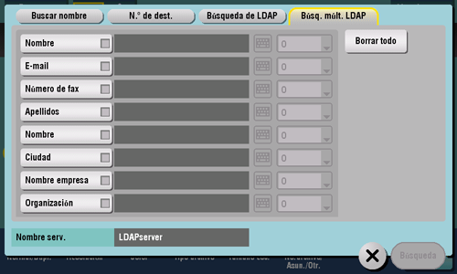Existen dos formas de realizar la búsqueda: mediante la utilización de [Búsqueda de LDAP], donde se busca un número de fax por medio de una única palabra clave y mediante la utilización de [Búsq. múlt. LDAP], donde se busca un número de fax por medio de una combinación de palabras clave de diferentes categorías.