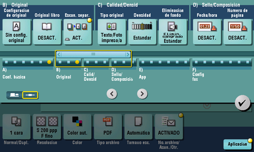 Toque [Aplicación] - [Original] - [Escan. separ.] y configúrelo en [ACTIVADO].