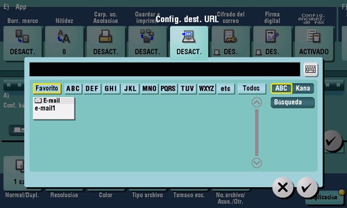 Toque [Aplicación] - [App] - [Config. dest. URL] e introduzca directamente la dirección de correo electrónico para notificar la ubicación de almacenamiento o seleccione la dirección de correo electrónico que desea de la libreta de direcciones.