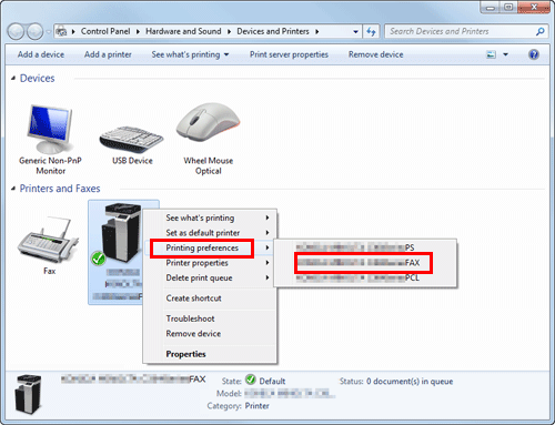 En Windows 7/8/8.1/Server 2008 R2/Server 2012/Server 2012 R2, haga clic con el botón derecho en el icono de la impresora instalada y, en [Preferencias de impresión], haga clic en el nombre de impresora que se muestra.