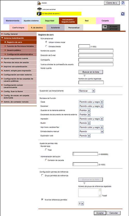 En el modo Administrador, seleccione [Aut.usuario / Seguim.cuenta] - [Sistema Autenticación] - [Registro de usrs] - [Editar] y, a continuación, seleccione la casilla de verificación [Grupo permitido de referencia] y asigne un grupo permitido de referencia al usuario registrado.