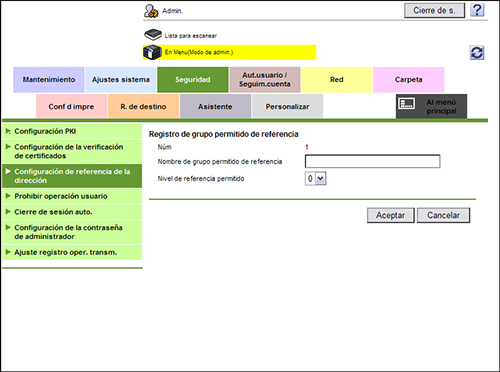 En el modo Administrador, seleccione [Seguridad] - [Configuración de referencia de la dirección] - [Editar] y especifique el nombre de grupo en [Nombre de grupo permitido de referencia] (utilizando 24 caracteres como máximo) para registrar el grupo permitido de referencia.