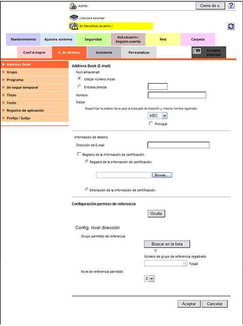 En el modo Administrador, seleccione [R. de destino] - [Address Book] - [Editar], seleccione [Grupo permitido de referencia] y, a continuación, asigne el grupo permitido de referencia para la libreta de direcciones.