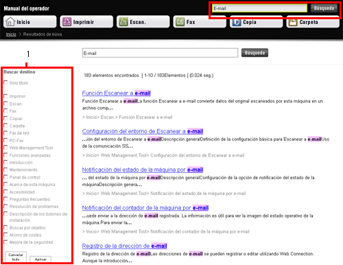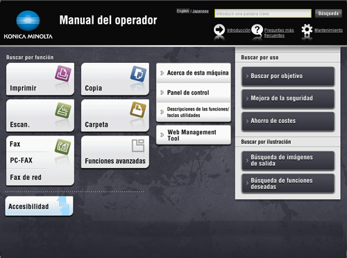 Introduzca una palabra clave en el campo de búsqueda en la parte superior del manual para buscar en el manual del operador. Introduzca cualquier palabra clave en el campo de entrada y haga clic en [Búsqueda].