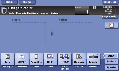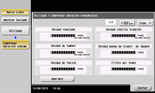 Compruebe el estado de los consumibles (nivel de consumo) utilizando el panel táctil. Si es necesario, es posible imprimir cada nivel en una lista.