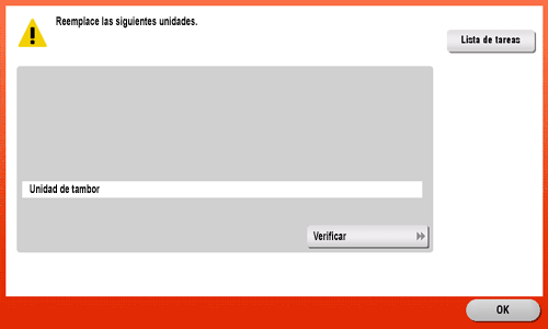 (Se requieren los ajustes del servicio de asistencia técnica para mostrar un mensaje sobre la unidad de tambor o la unidad de revelado. Para obtener más información, póngase en contacto con el servicio de asistencia técnica.)