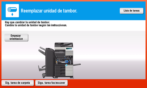 Cuando llega el momento de reemplazar un cartucho de tóner o unidad de tambor, aparece un mensaje solicitando el reemplazo. Realice la sustitución de acuerdo con el contrato de mantenimiento.