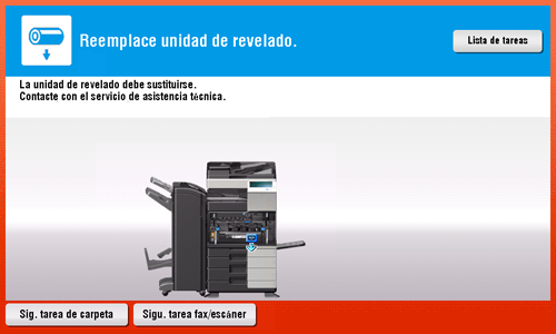 Si ha llegado el momento de reemplazar la unidad de revelado, se mostrará el mensaje que aparece a continuación. Si aparece el mensaje, póngase en contacto con el servicio de asistencia técnica.