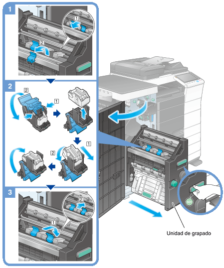 Asegúrese de reemplazar el cartucho de grapas después de que aparezca el mensaje correspondiente. Si el cartucho de grapas se retira antes de que aparezca el mensaje, se producirá un error.