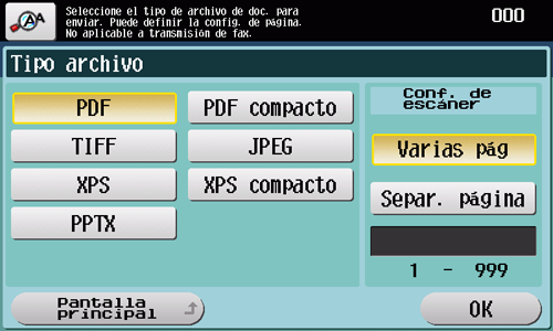 Los tipos de archivo disponibles son PDF, TIFF, JPEG, XPS, PPTX, DOCX, XLSX y otros tipos. Para almacenar datos importantes del original debe utilizarse el formato de archivo PDF cifrado con contraseña.