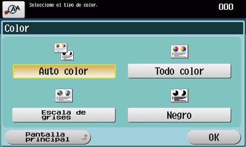 Existen cuatro modos de color: [Color automático] para realizar el escaneado en función del color original, [Todo color], [Escala de grises] y [Negro].