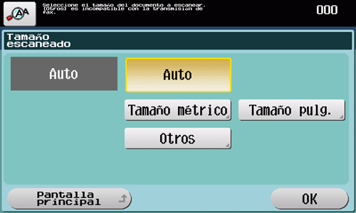 [Tamaño pulg.] | Seleccione esta opción para escanear un original de tamaño en pulgadas. Toque [Tamaño pulg.] y seleccione un tamaño en pulgadas estándar. |