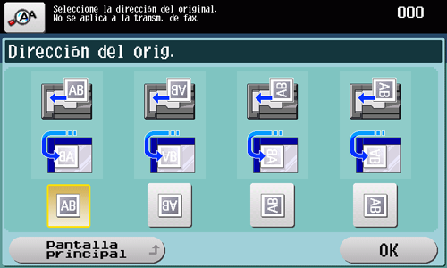 Toque [Config. escaneado] - [Configuración del original] - [Dirección del orig.] para seleccionar la dirección de carga del original.
