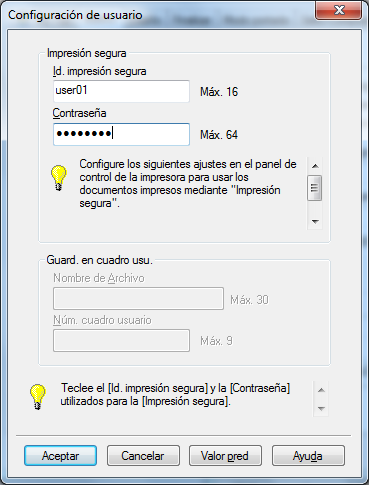 Introduzca el [Id. impresión segura] y la [Contraseña] y, a continuación, haga clic en [Aceptar].