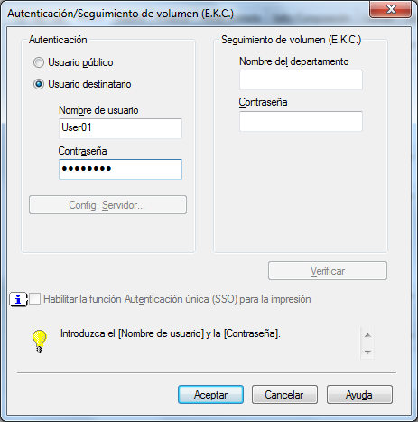 R2. En la ventana Propiedades del controlador de impresora, modifique la configuración de autenticación de usuario a la correcta.