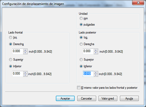 [Lado frontal]/[Lado posterior] | Configure la dirección y el valor para modificar la posición de impresión. Para una impresión a 2 caras, al seleccionar la casilla de verificación [El mismo valor para los lados frontal y posterior] es posible especificar el mismo valor para los lados frontal y posterior. |