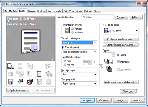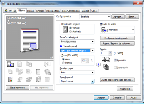 En [Tamaño papel] en la ficha [Básico], seleccione el tamaño de papel correcto.